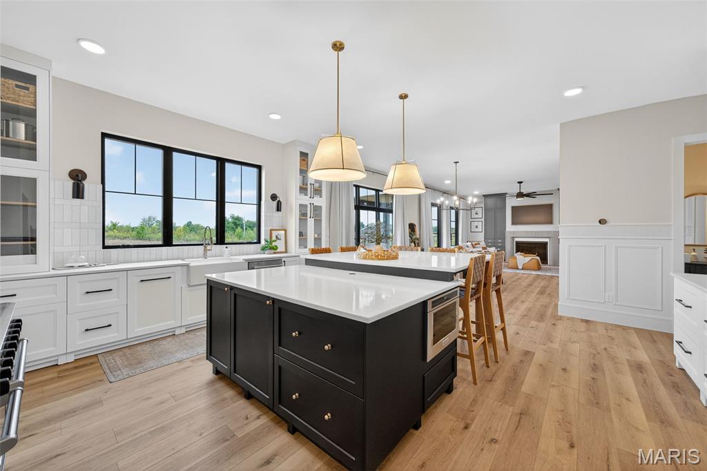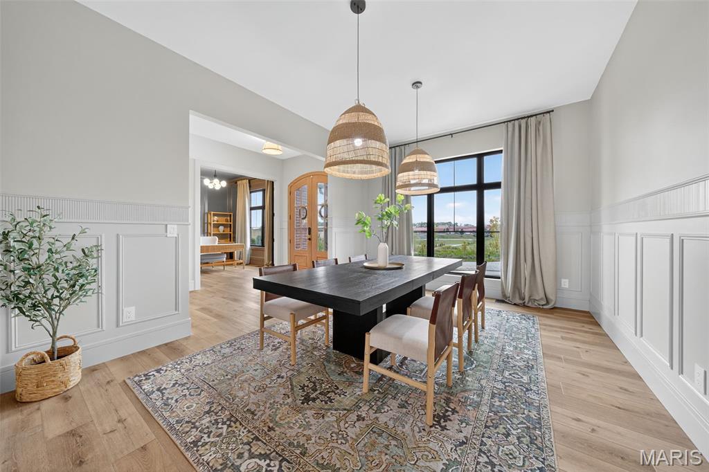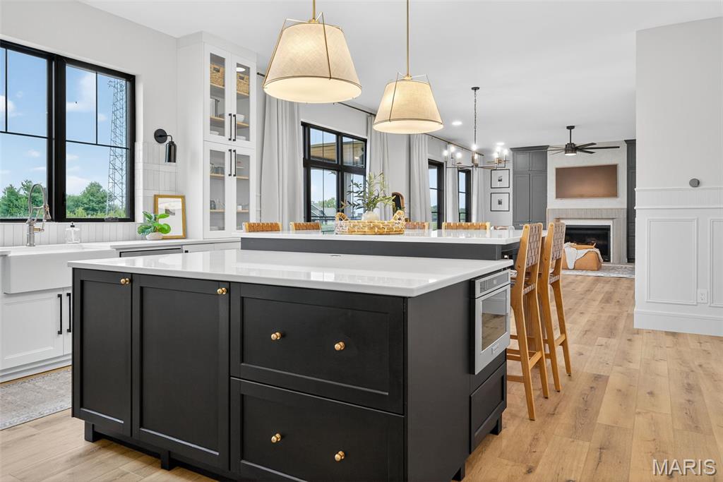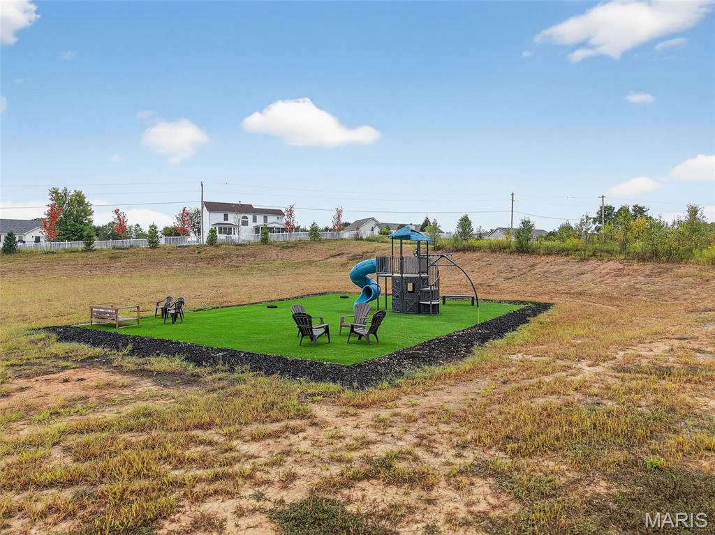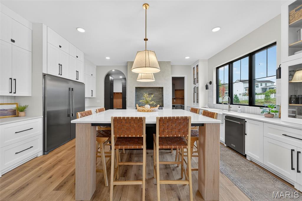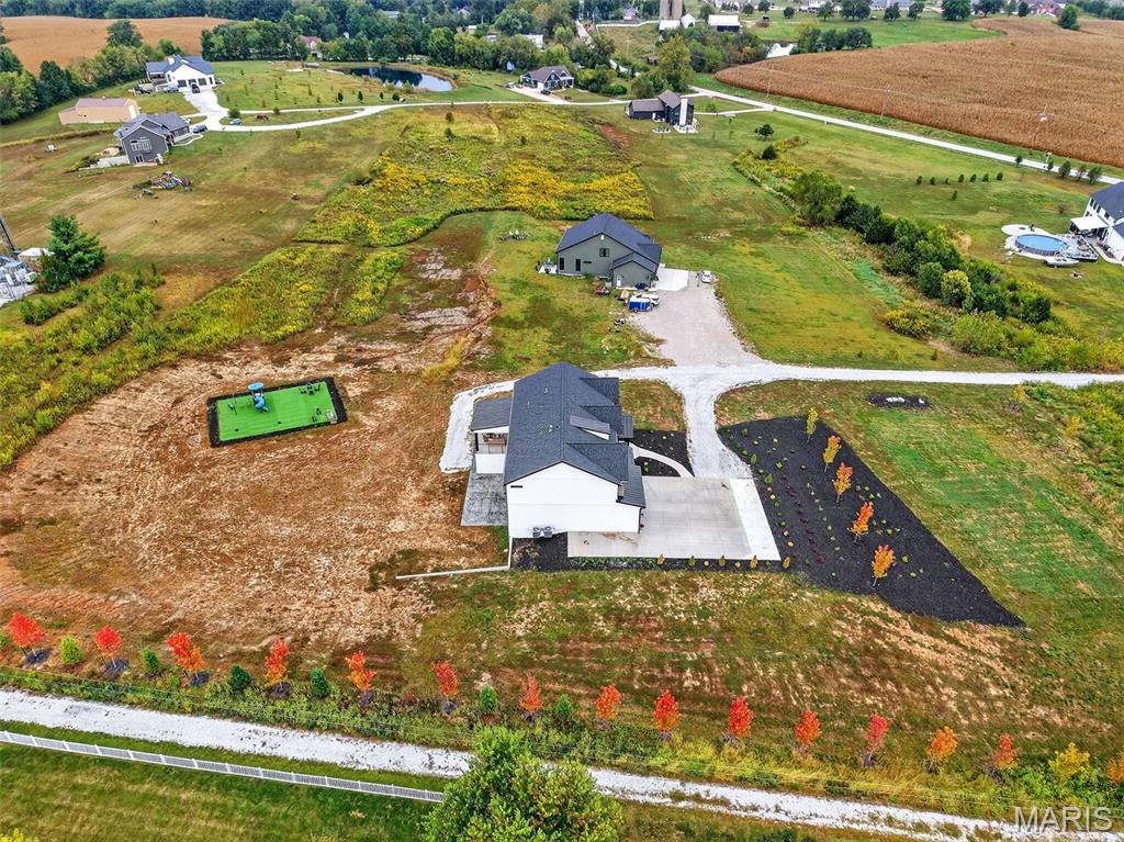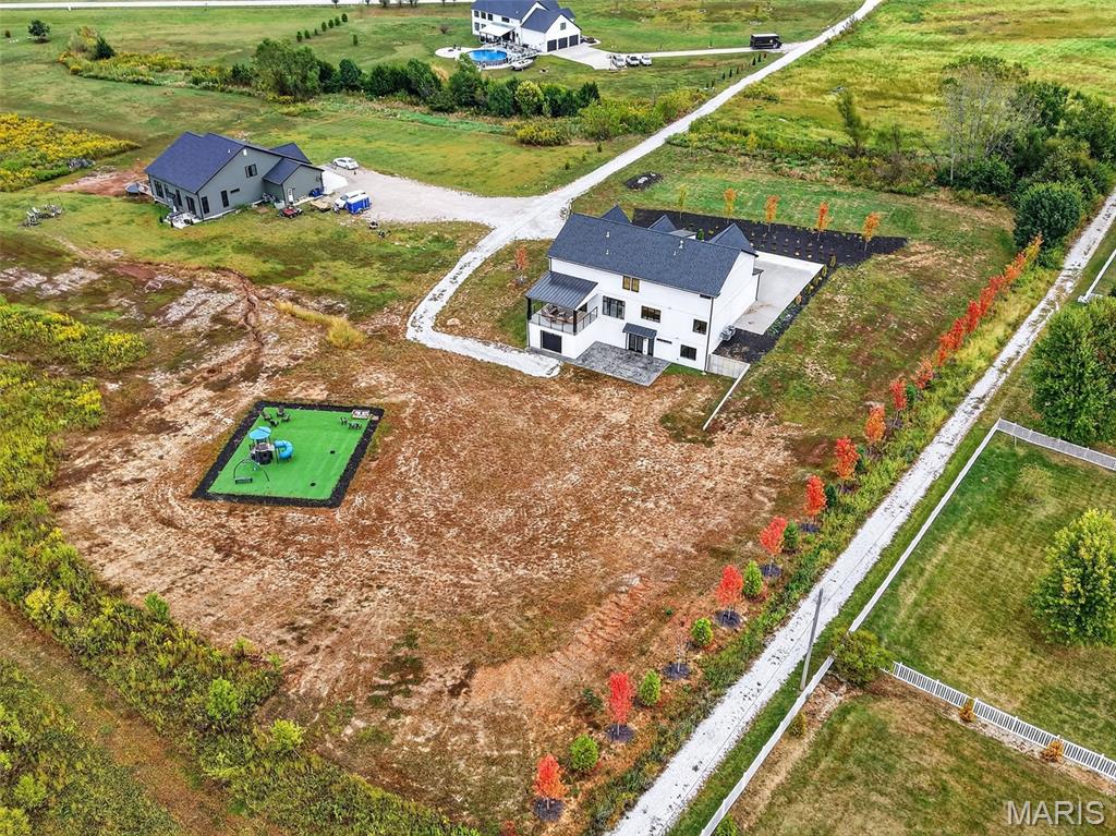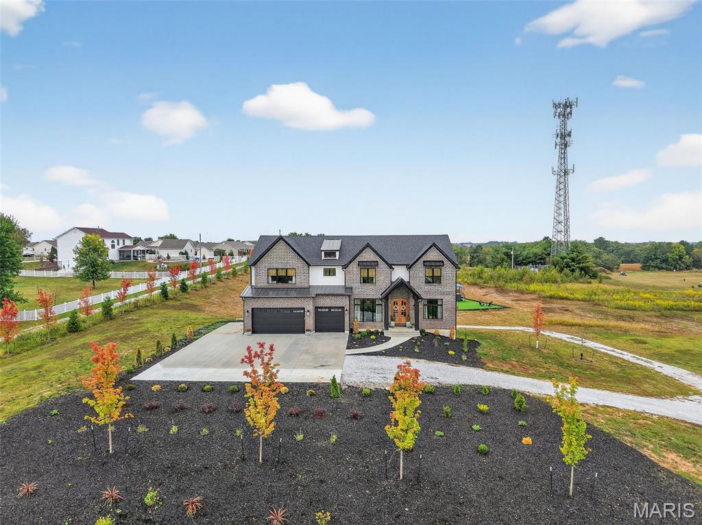 Experience luxury country living minutes from everything in this stunning two-story estate set on over 3 private acres. From the moment you step inside, soaring 10-foot ceilings & gleaming casement windows create an airy, light-filled atmosphere. The main floor flows effortlessly from your private office to a chef’s dream kitchen with custom cabinetry, massive 9-foot quartz island, luxury KitchenAid appliances, & high-end finishes including a Delta Brizo pot filler. Hosting the holidays will be a dream with multiple options for dining & butler's pantry for preparation & storage. The family room boasts a cozy gas fireplace, views of the property & access to the covered patio area for the ultimate relaxation. Upstairs, vaulted ceilings, additional guest bath & bonus entertainment room with a beverage & snack station provide the perfect retreat. The home offers three en suites, including a massive primary suite with its own gas fireplace, custom walk-in closet, & spa-like bath. Guest bedrooms feature 9-foot ceilings, 2 en suites & custom built-ins for both function & style. A second-floor laundry room adds convenience. The lower level is designed with future entertaining & multigenerational families in mind—complete with private garage, rough-ins for two additional baths & walk out to patio entertaining. Don't forget the playground! This home is the perfect blend of refined elegance & practical comfort, offering unmatched space, privacy & amenities in an ideal location.