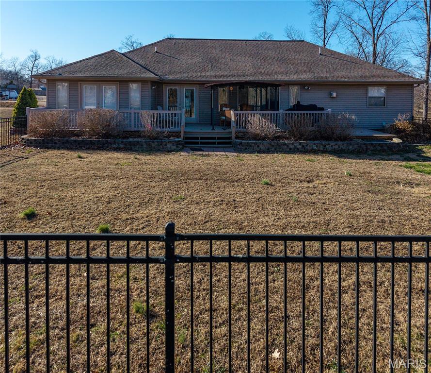 Executive Home on Hill Top Setting Just Outside of Town. Close to the Municipal Golf Course. Sits on 1.72 Acres—fenced rod iron back yard. Large Living Room with double-tray ceiling and can-lighting. Kitchen and Dining Room with tray ceiling. Country Kitchen with lots of Cabinets and Counter Space for Cooking! Large back deck partially covered. Fenced back yard for your children or fur baby! Indirect lighting—Bay Window - ADA accessible. Recessed light in double tray ceiling in the Living Room, LED 5/23. This home has a handicap shower/bars and a seat. 36'' doors, wheelchair ready. NO shelving stays in the garage. Soaking tub and Shower with a large walk-in closet. New flooring, Pantry, pull-out drawers, and generator backup. New Metal Storage shed with double lofts. This one is move-in ready! Sits on a dead-end road for lots of privacy, with all the conveniences.
