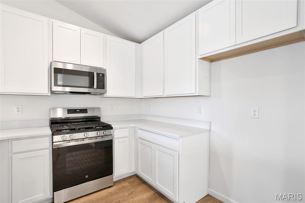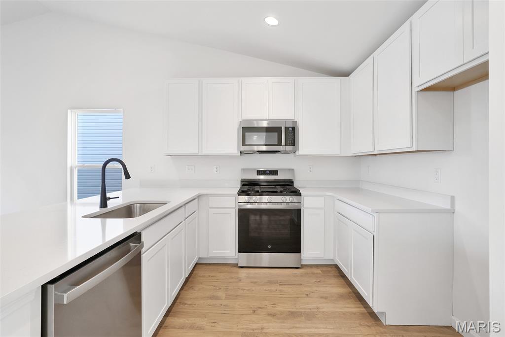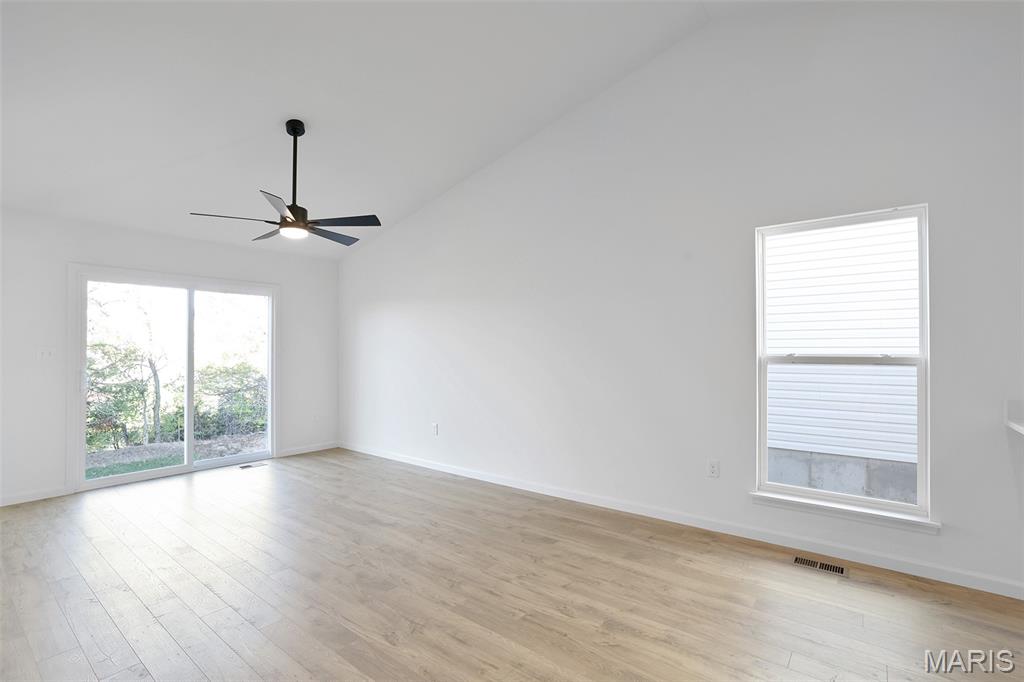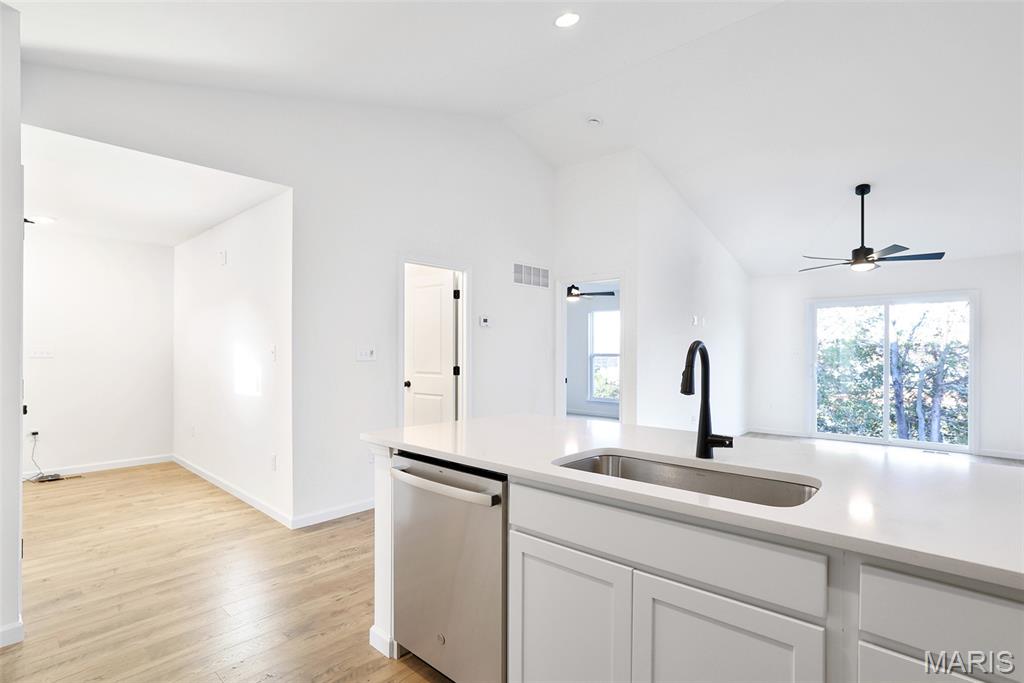 McBride Homes Summerfield Ranch 2BR, 1BA home is move in READY NOW! This cozy cottage is perfect for entertaining w/vaulted ceilings, 6ft windows, & beautiful wood laminate flooring in the main living areas. The kitchen features level 4 painted white 42” tall cabinets, quartz countertops, large peninsula w/ breakfast bar, & stainless-steel GE appliances. Spacious living room w/ceiling fan & sliding glass door to the backyard. The master suite features large window, ceiling fan & dual closets w/ private bath featuring a 5ft walk-in shower & double bowl vanity. White two panel interior doors, upgraded lighting w/ceiling fan prewire in 2nd bedroom, main floor laundry, & 1 car garage. Lower level includes a ¾ bath rough-in for future finish. St Andrews Meadows offers two separate villages of single-family homes backing to Veterans Memorial Park. Enjoy peace of mind with McBride Homes' 10-yr builders’ warranty & incredible customer service! Similar photos shown.