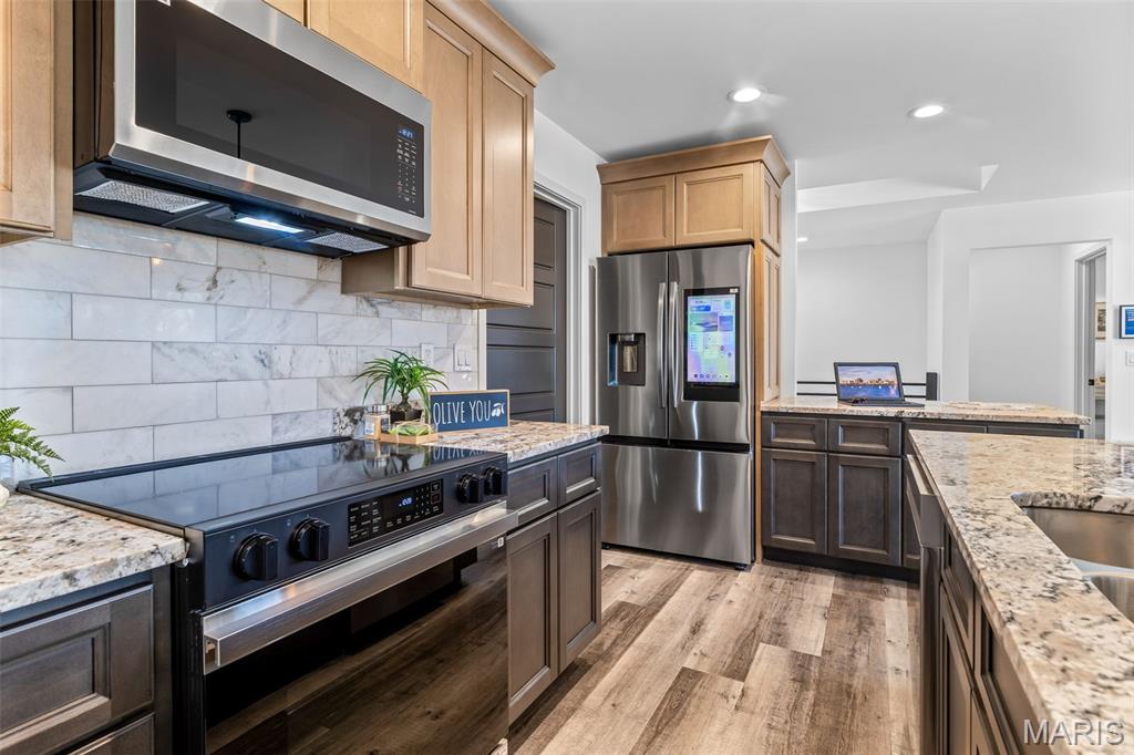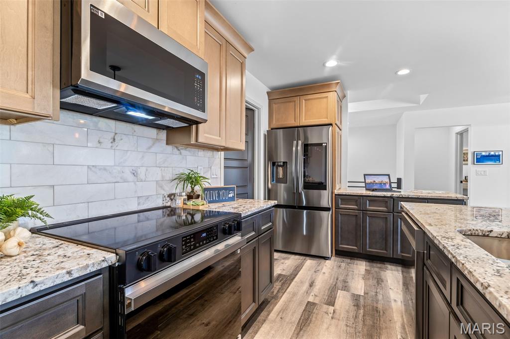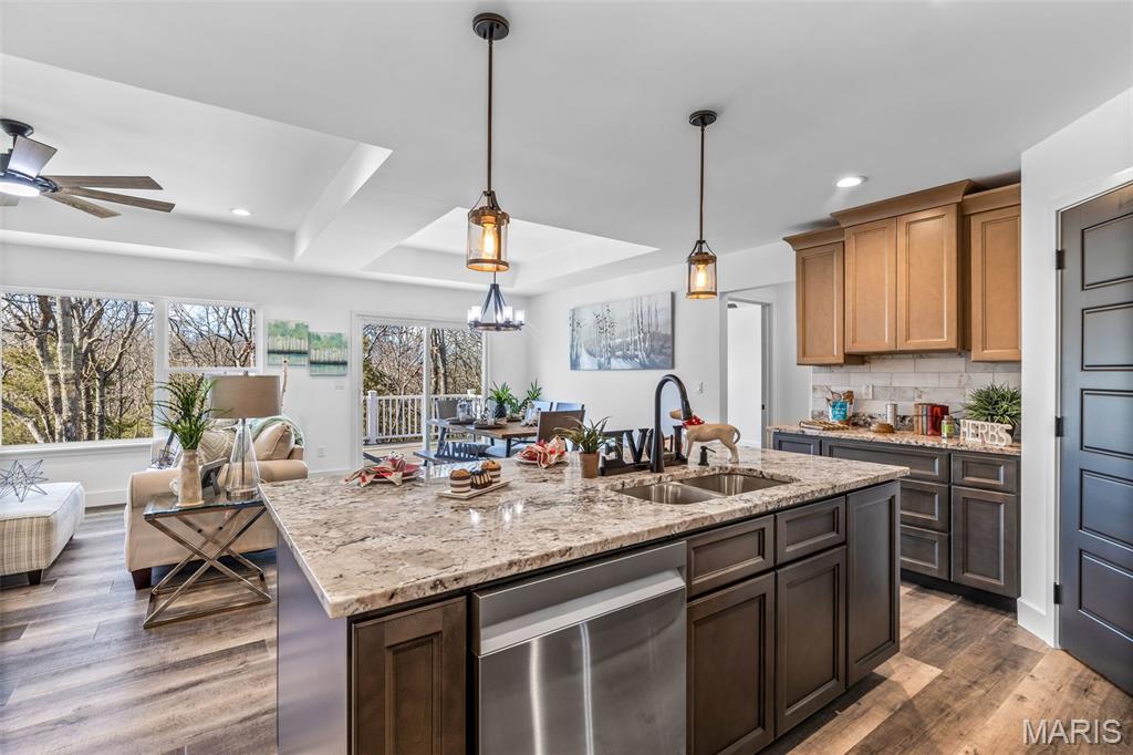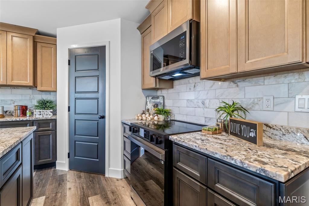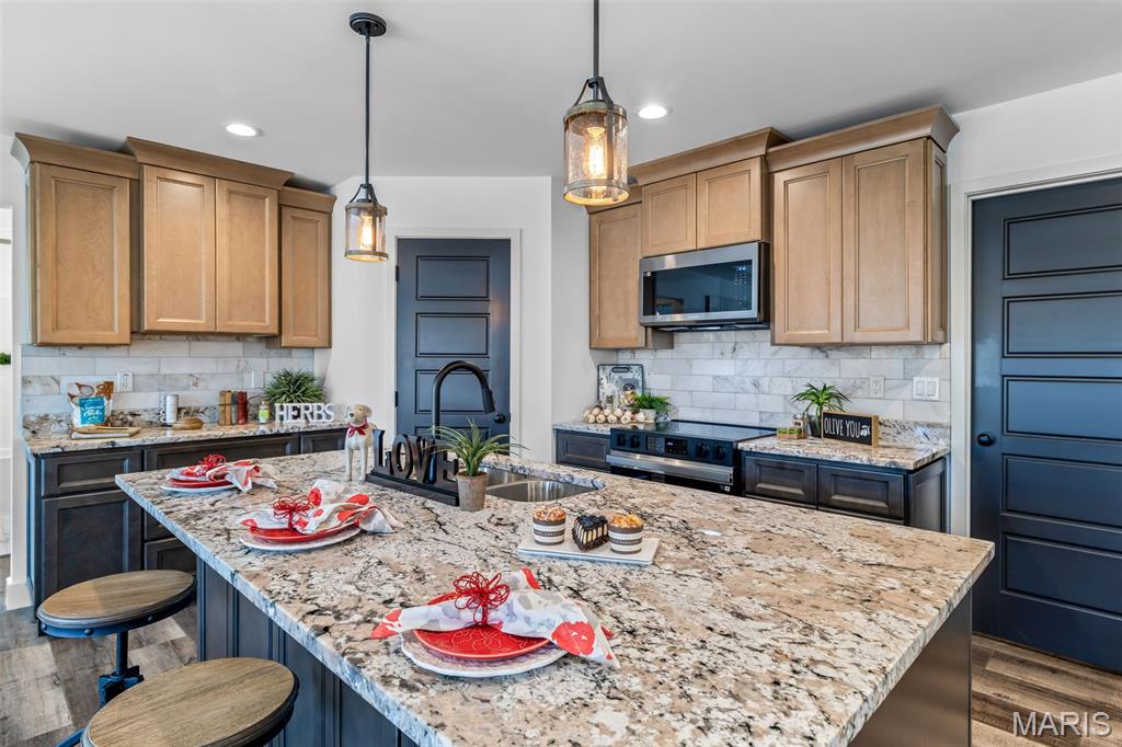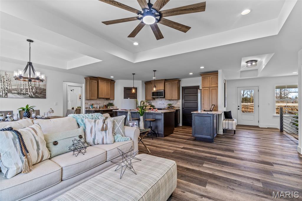 New construction ranch JUST completed and move-in ready! This craftsman quality 3 bedroom, 2 bath home sits on a spacious half-acre lot and features an open, thoughtfully designed layout with upscale finishes throughout. The kitchen offers a large island with breakfast bar, upgraded maple cabinetry with soft close doors and drawers, granite countertops, stainless smart appliances, backsplash, and a walk-in pantry. Tray ceilings and 8-foot ceilings add to the bright, open feel! The primary suite includes a private bath with double bowl vanity, and main floor laundry adds convenience. A walk-out basement provides excellent future living space with an egress window and rough in bath, as well as a below-grade concrete storm shelter. Enjoy outdoor living on the 12x14 composite deck overlooking a wooded backdrop. The oversized finished 3 car garage features 8 foot tall doors, insulated doors, an electric car charger, and extended driveway space. A quality built home offering space, functionality, and modern comfort!!