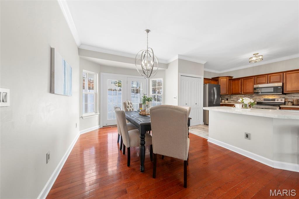 Spacious 3-bedroom, 2 full-bath, 2 half-bath home welcomes you. A bright, open floor plan filled with natural light, creates a warm and inviting atmosphere. Hardwood floors and crown molding grace the main level, adding an elegant touch throughout. The living room features a cozy gas fireplace sure to become a favorite gathering spot. An adjoining dining room provides an ideal space for entertaining, with French doors leading to a covered patio overlooking the backyard. The family chef will love the spacious kitchen, complete with a breakfast bar, stainless appliances, quartz countertops, custom cabinetry, and a decorative backsplash. Retreat to the primary en-suite offering a walk-in closet and private bath with double sinks, a whirlpool tub, and a separate shower. A laundry room and half bath complete the main level. The upper level includes two generously sized bedrooms with large closets and a full bath. The walkout lower level features an expansive family room with built-in shelving, a half bath, and multiple areas for additional storage. Step outside to enjoy the fenced backyard—perfect for BBQs, pets, and play. A two-car attached garage is a welcome convenience during the winter months. Ideally located near Hwy 141, shopping, dining, and more.