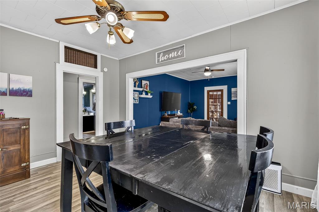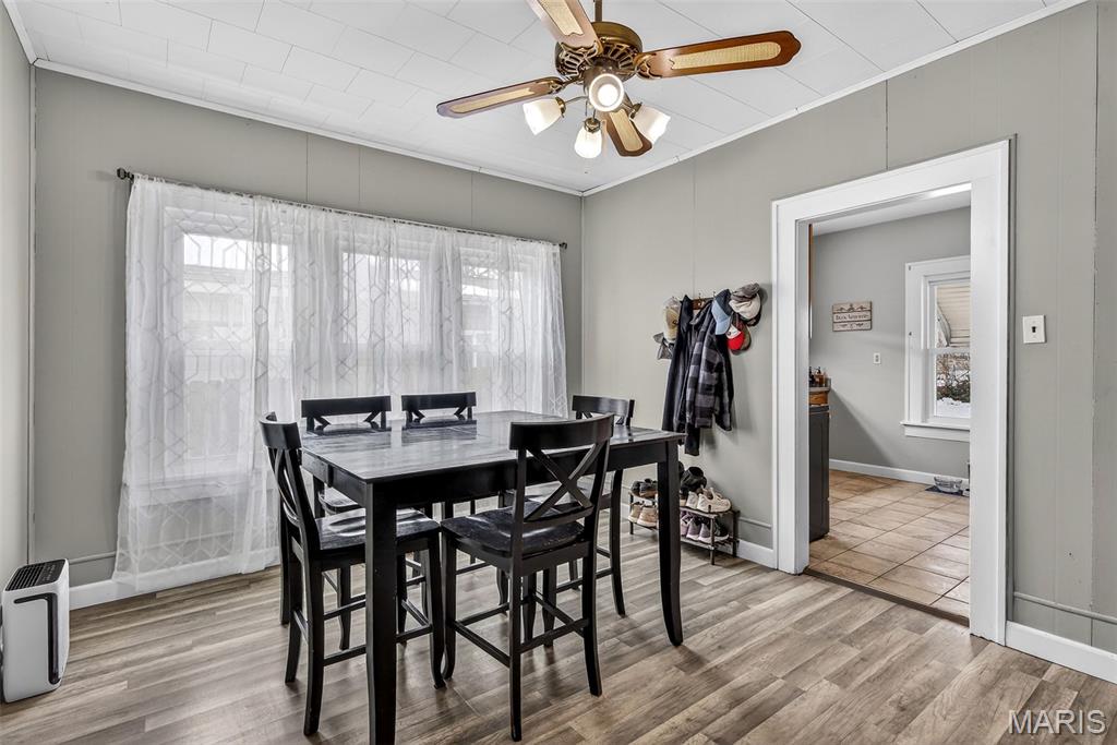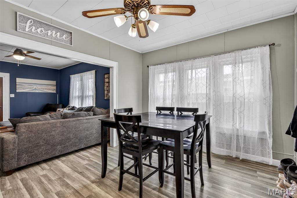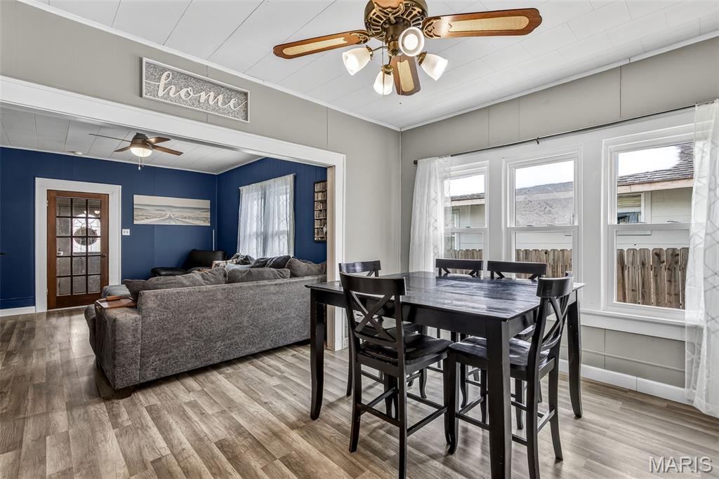 Charming downtown bungalow featuring 2 bedrooms and 1 bath with a great floor plan and spacious rooms. The home offers newer flooring, stainless steel appliances, and a separate dining area. Enjoy the enclosed front porch, newer vinyl windows, and a level backyard with back patio, perfect for relaxing or entertaining. A detached garage plus additional parking add convenience. Very well maintained and ideally located in town, just steps from City Hall and all downtown amenities.