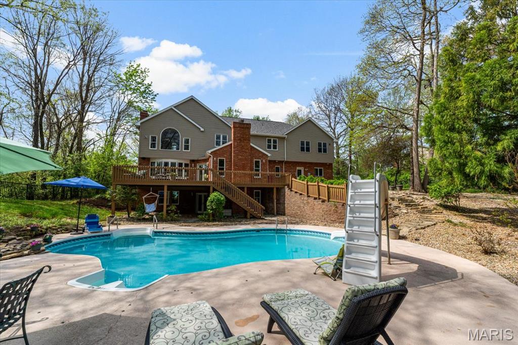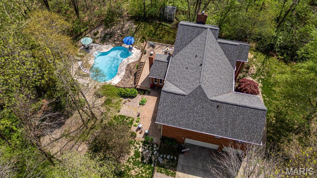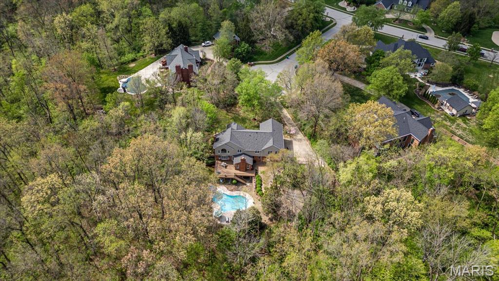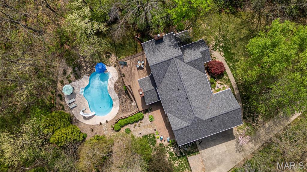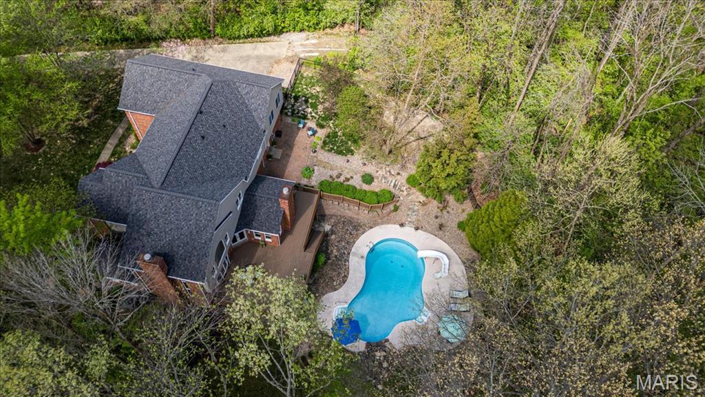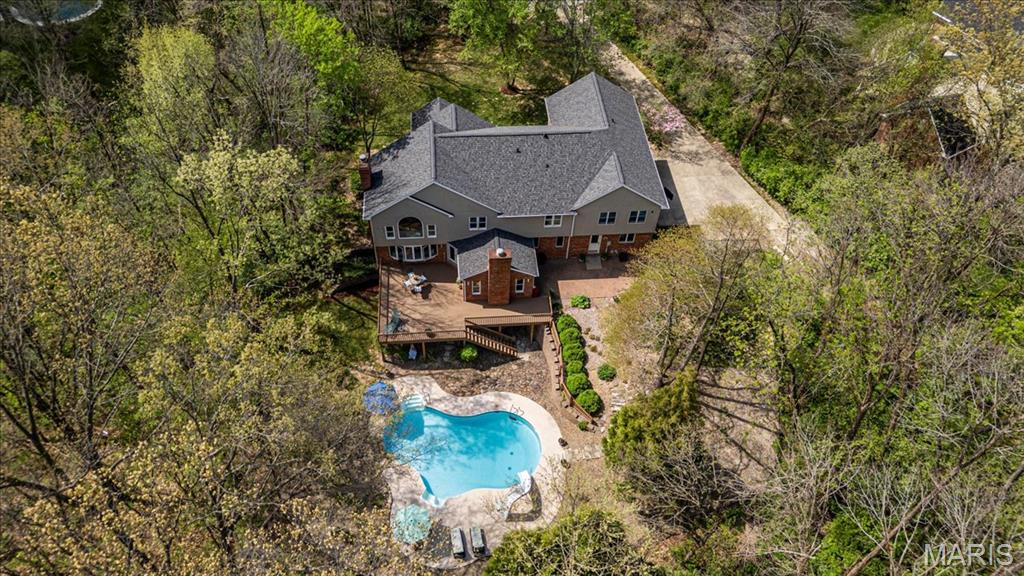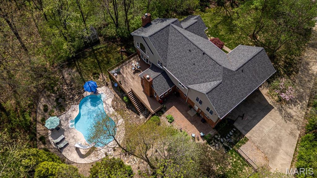 CUSTOM 2-STORY ON A PRIVATE, 1 1/2 ACRE WOODED LOT WITH AN INGROUND POOL! Welcoming cathedral great room with gas fireplace, built-ins and a window seat, plus a cozy hearth room with wood burning fireplace. Kitchen updated with a planning desk, tile backsplash, newer appliances and plenty of space for people to gather around the large island. Off the kitchen you will find a formal dining room that is currently being used as a living room AND a main level laundry with 1/2 bath. Upstairs you'll find the primary suite with tray ceiling and an updated bath with dual vanities, soaking tub and separate shower, plus 3 additional bedrooms and-one oversized over the garage with a walk-in closet. The walk-out lower-level offers cozy family room, a rec space with pool table, wet bar, bonus room and another full bathroom. Walk out to the gorgeous backyard with mature trees, an inground pool firepit area and storage shed. Extras: laundry chute, attic fan, Anderson windows/doors, zoned HVAC and NEW roof. MUST SEE!
