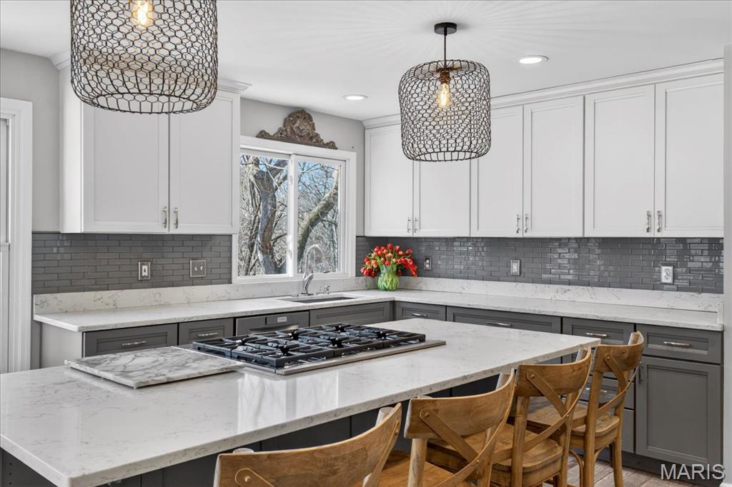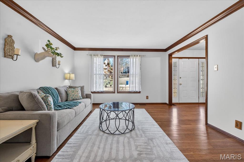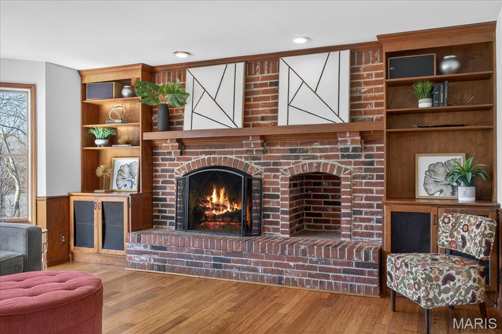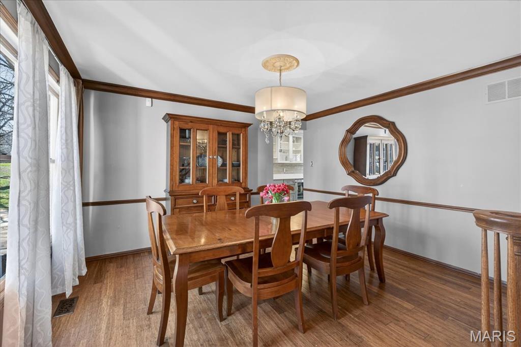 Tucked within the beloved Kirkwood School District, this beautifully updated two-story offers the perfect balance of timeless character, thoughtful updates, and an unbeatable central location just minutes from major highways, shopping, dining, and everyday convenience. From the moment you step inside, bamboo hardwood floors create a sense of warmth and continuity throughout much of the main and upper levels, complemented by classic millwork, statement lighting, and inviting, comfortable living spaces. The welcoming entry opens to an elegant dining room accented by crown molding, chair rail, and chandelier, a space made for both everyday dinners and special celebrations. The living room flows effortlessly into the spacious family room, where a wood-burning fireplace, custom built-ins, wainscoting, and sun-filled bay windows create a space that feels both cozy and connected. A wet bar with custom cabinetry adds both charm and functionality for entertaining and daily living. The kitchen is truly the heart of the home, beautifully designed with custom soft-close cabinetry, quartz countertops, tile backsplash, under-cabinet lighting, stainless appliances, gas cooktop, double wall ovens, wine fridge, and a large center island that invites connection. A sliding glass door opens directly to the covered deck, creating seamless indoor-outdoor flow and extending the living space, perfect for morning coffee, quiet evenings, or hosting with ease. Just beyond, the laundry/mudroom provide everyday practicality and organization. Upstairs, the primary suite offers a peaceful retreat with hardwood floors, generous closet space including a walk-in closet, and a beautifully updated spa-like bath featuring a walk-in shower, soaking tub, dual vanity, and custom tilework. Three additional bedrooms with hardwood flooring and ample closet space share a well-appointed hall bath. The finished lower level expands the home’s versatility with a large recreation space, wet bar, wine fridge, full bath, and a flexible bonus room ideal for guests, a home office, or workout space. Outdoor living is just as inviting, with a spacious partially covered deck with ceiling fan, stamped concrete patio, and built-in firepit, a setting designed for gathering, relaxing, and enjoying every season. With its rare combination of prime location, lifestyle, and highly sought-after schools, this Des Peres home offers the warmth, space, and everyday livability buyers are always searching for.