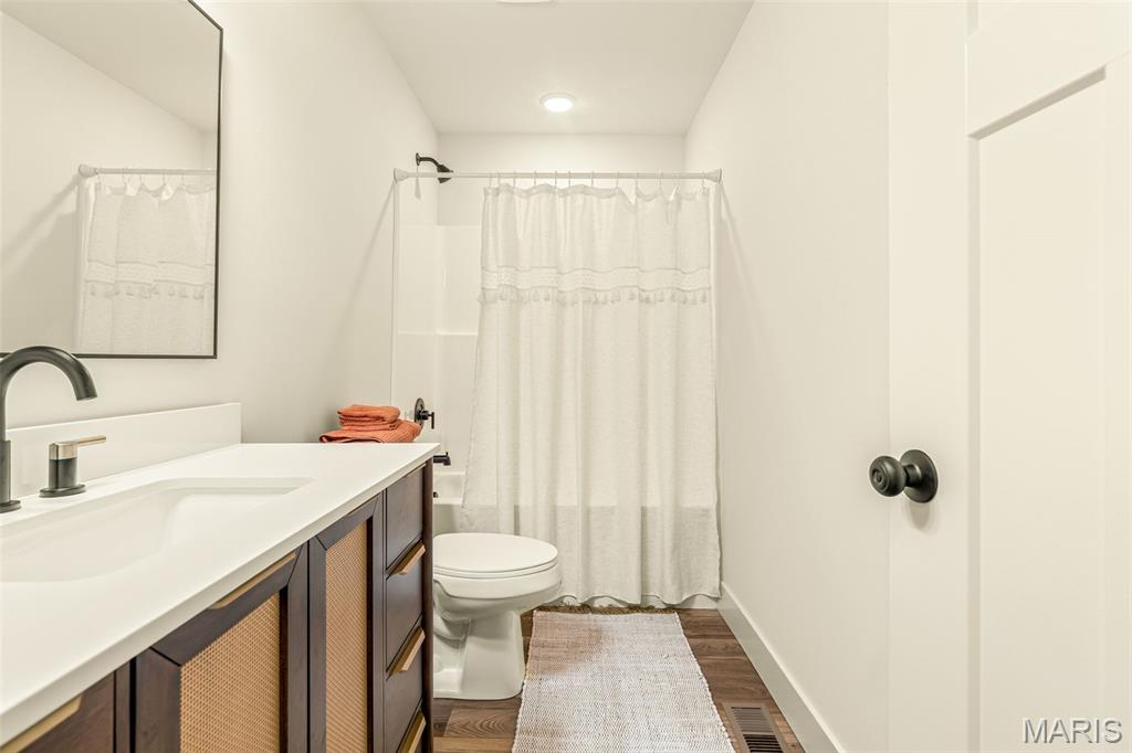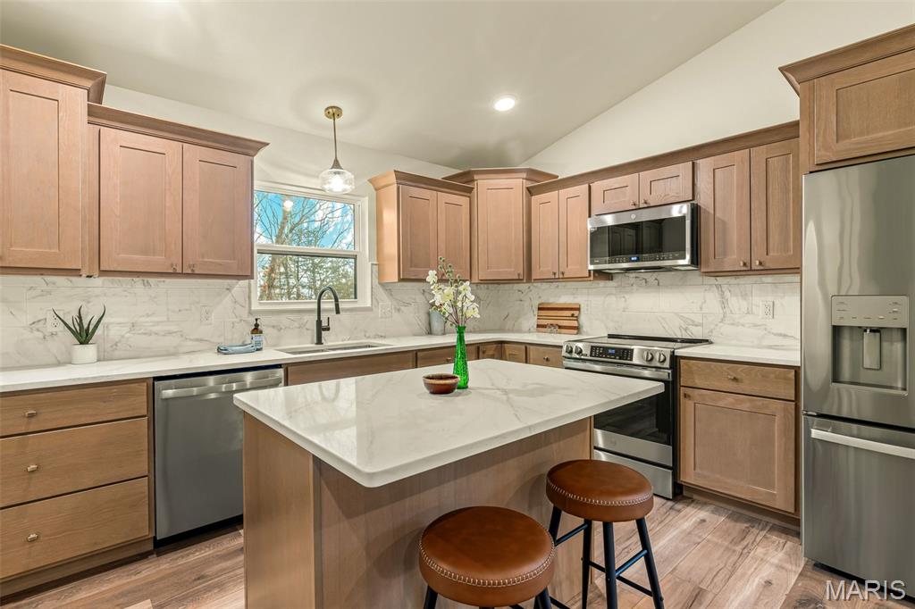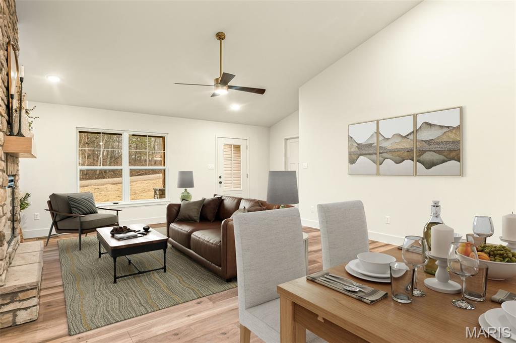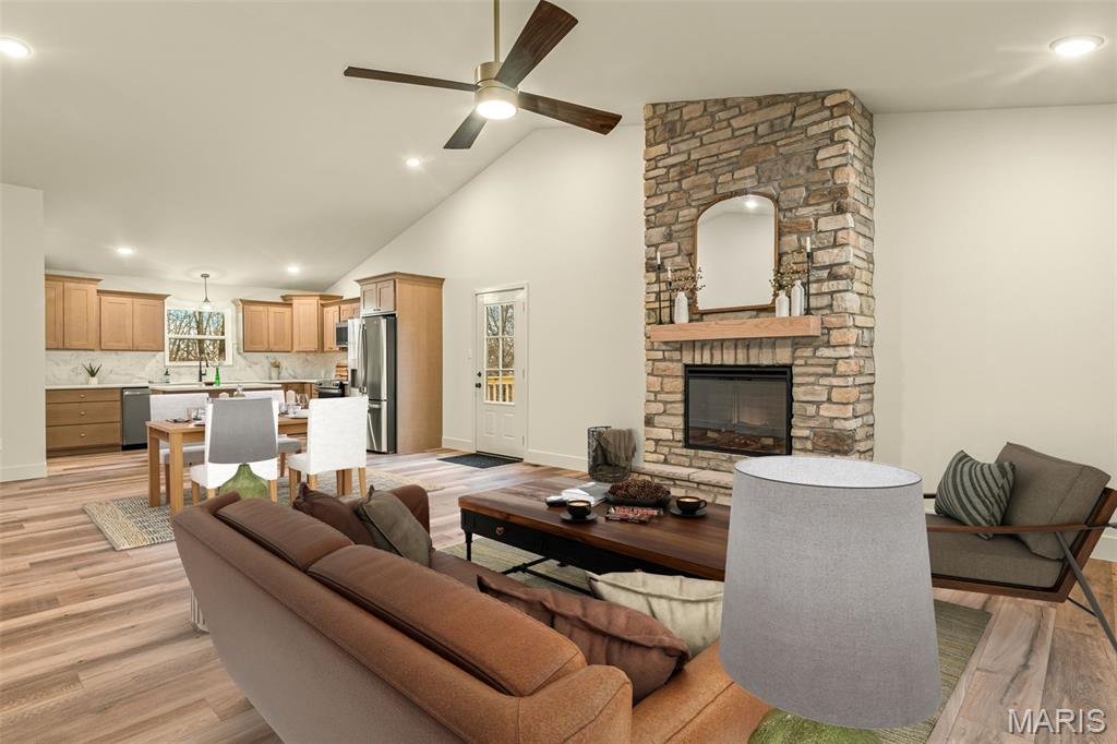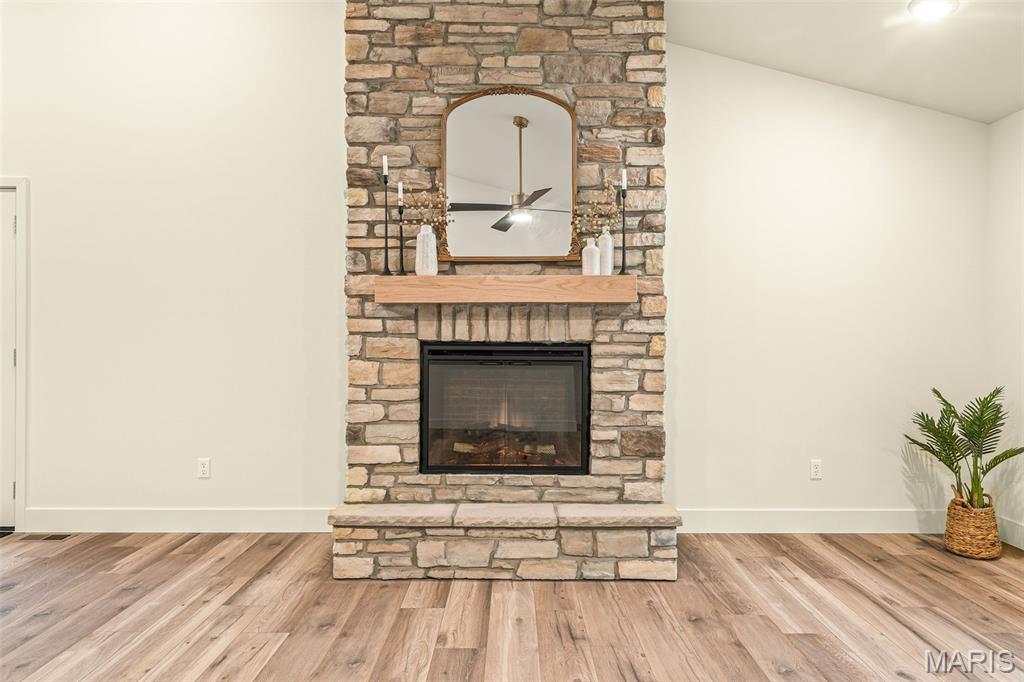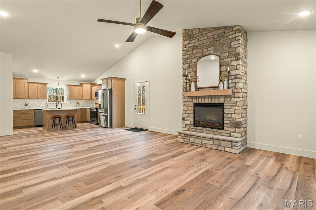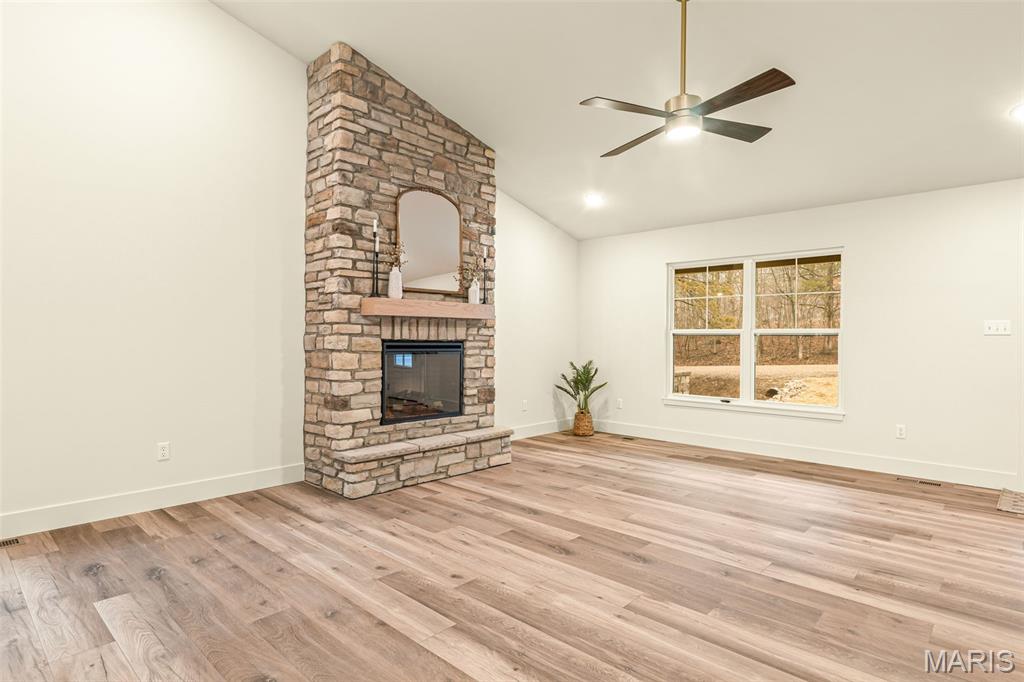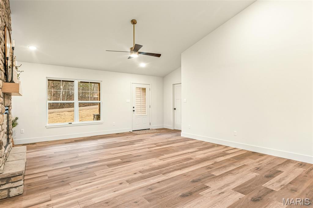 OPEN HOUSE Friday, March 6th 5-7p.m. ~ BRAND NEW home in Terre du Lac offers 3 bedrooms, 2 full bathrooms, 2 car side-entry garage & covered front porch. Exterior stone accents are also found inside! Floor to ceiling stone surrounds the electric fireplace complete with hearth and mantle. Vaulted ceilings and open floor plan with 100% waterproof hybrid resilient plank flooring throughout. 5" solid wood base trim. Dark bronze tilt-in windows. Kitchen features soft close oak cabinets with hardware & quartz countertops, a center island, crown molding, all four GE stainless appliances, backsplash, garbage disposal & walk-in pantry with custom shelving & cabinets with countertop. Primary bedroom features a walk-in closet & full bath with Onyx step-in shower and glass shower door enclosure. The spacious main floor laundry just off the attached garage is complete with mud sink & shelving. Deck overlooks wooded view. Walkout basement is a blank canvas with rough-in plumbing for future bath, egress windows & upgrade feature of an 8'x19' concrete vault room with electric and door. Spectrum available. Builder provides a one-year warranty. All measurements are approximate. Private lake community 1 hour south of STL. 16 lakes, fish, boat, swim.