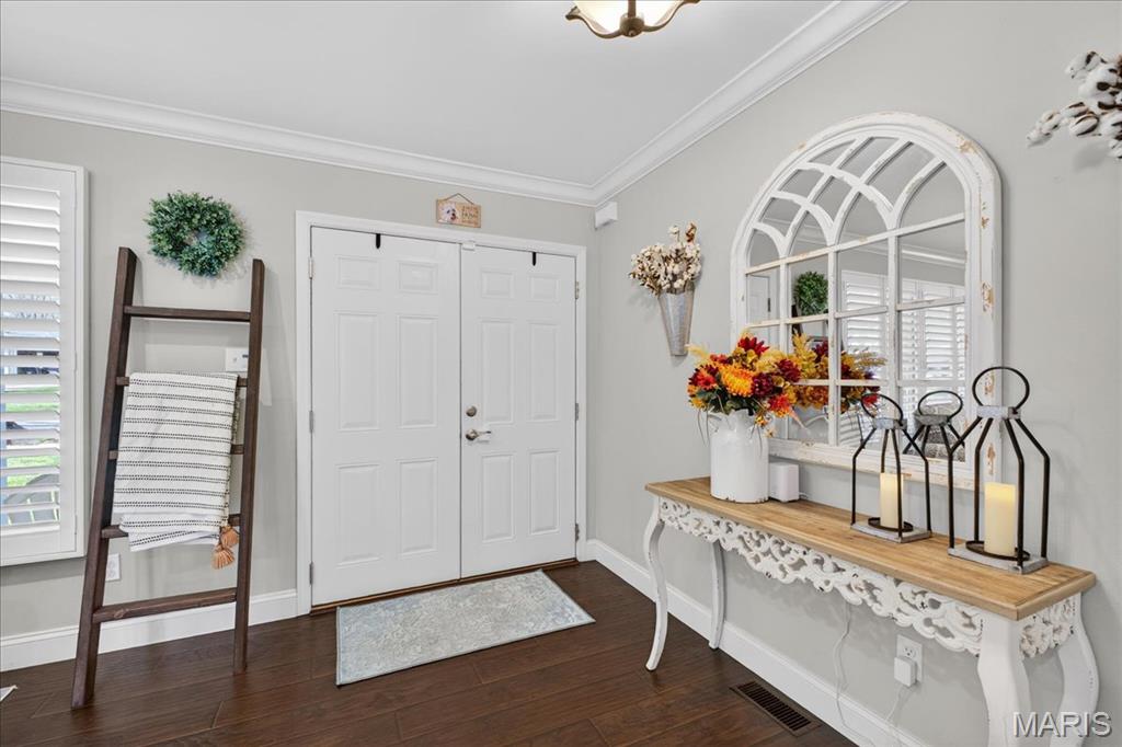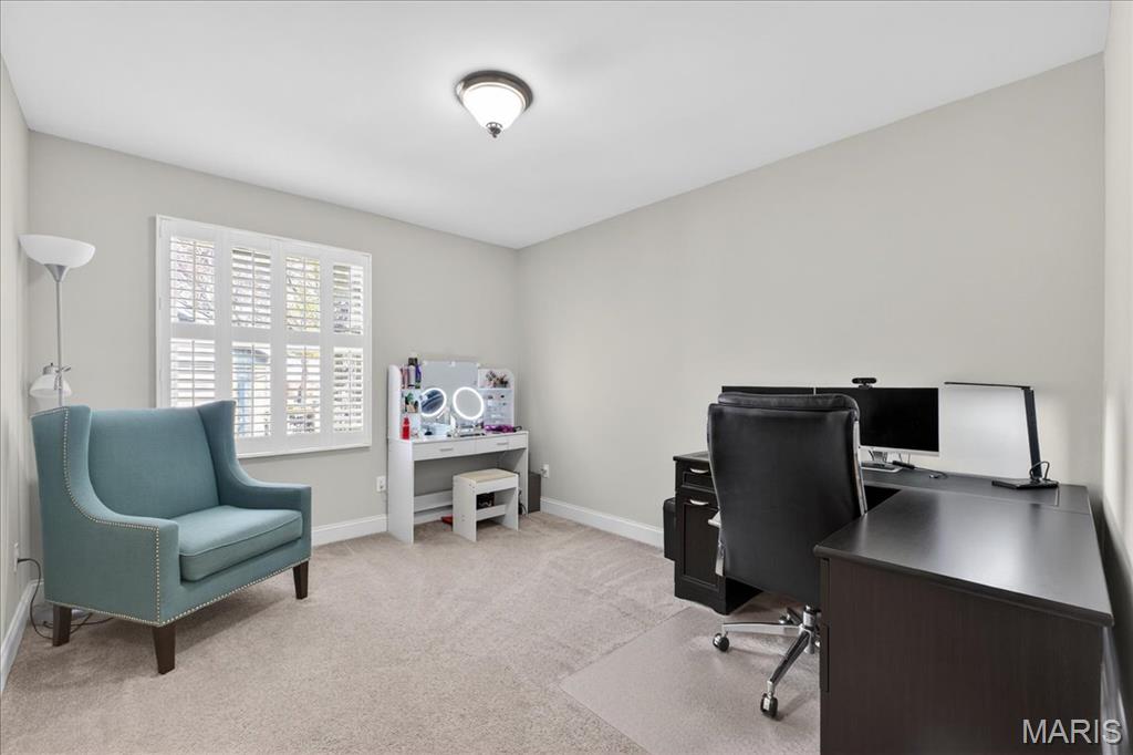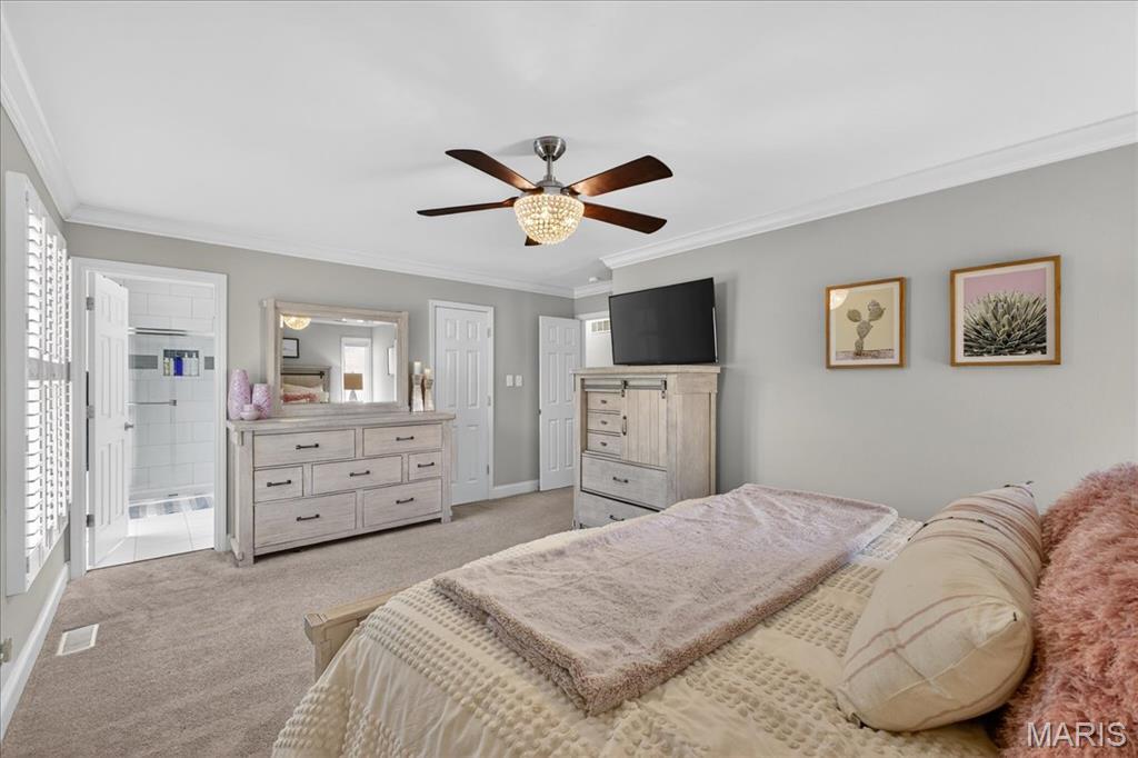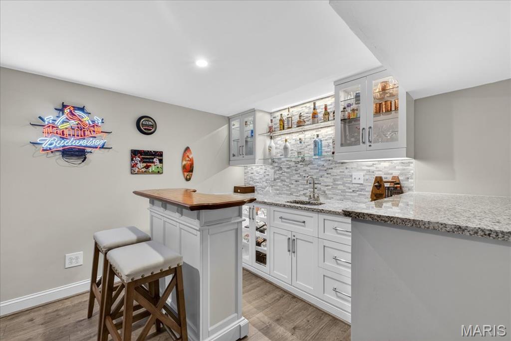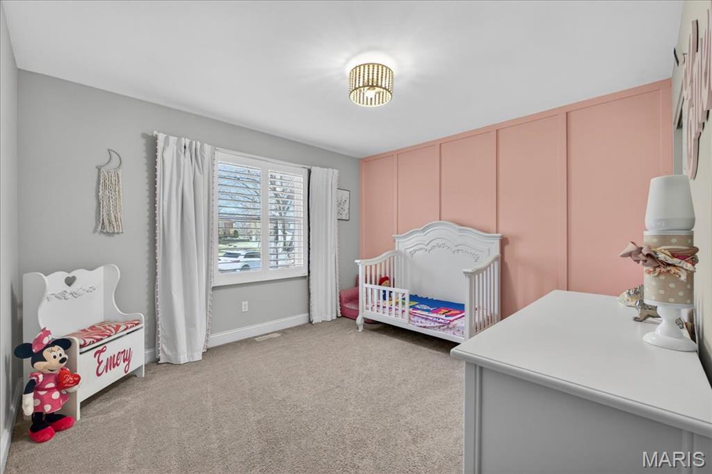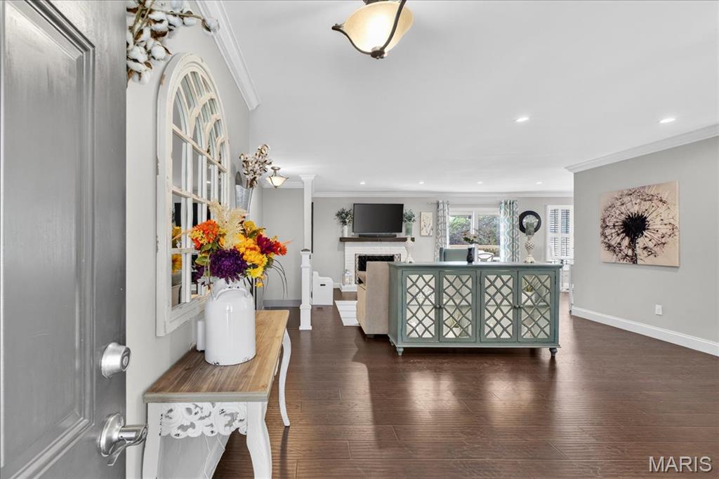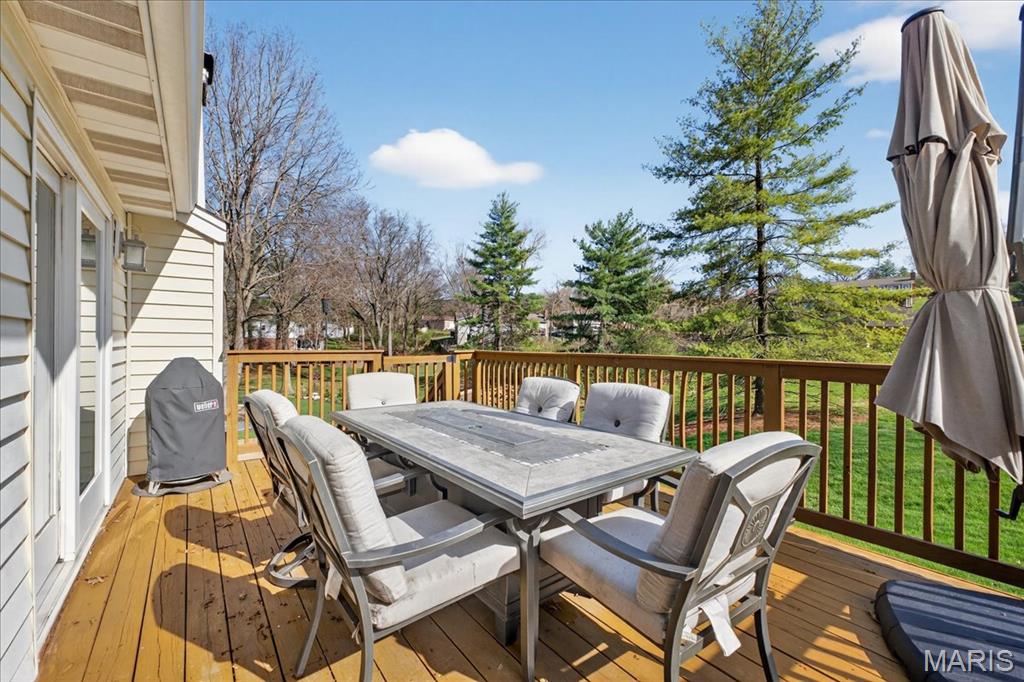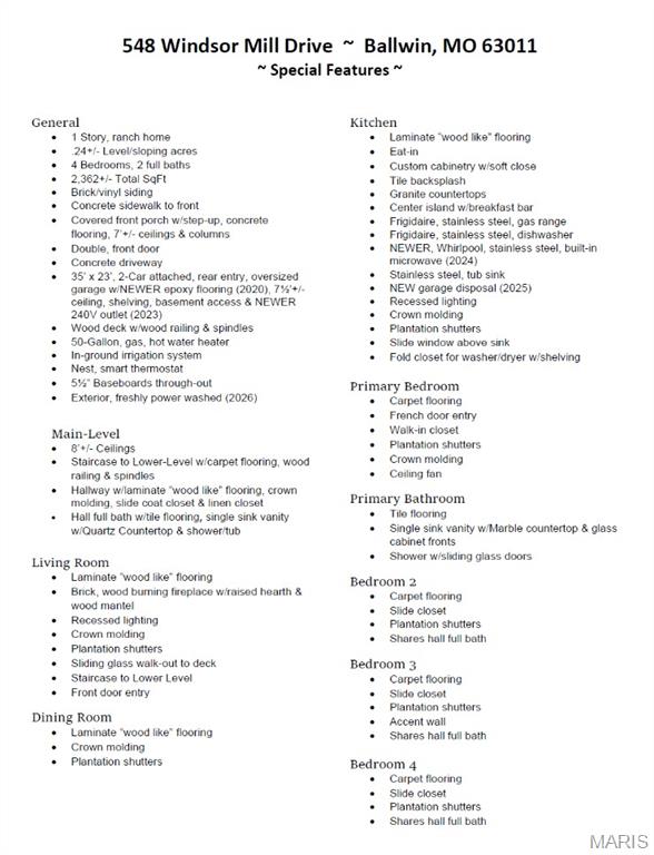 TURN-KEY, lovely 4 bedroom, 2 full bath, 2,362+/- SqFt ranch home in the HIGHLY desirable Ballwin neighborhood, Brushcreek! Covered front porch with double front door greets you as you step inside. Living room boasts laminate “wood like” flooring, brick wood burning fireplace, recessed lighting, plantation shutters & sliding glass walk-out to deck allowing plenty of natural light. Updated kitchen offers custom cabinetry, stainless steel appliances, granite countertops, center island w/breakfast bar, tile backsplash, plantation shutters & laundry closet. Primary suite with French door entry, carpet, walk-in closet, & ensuite full bath with a custom shower w/sliding glass doors & single sink vanity w/Marble. Other 3 bedrooms with carpet, slide closets & share hall bath with shower/tub & single sink vanity w/Quartz. Dining room completes the main level. Lower level extends living quarters with a large rec room with carpet, recessed lighting, recently added (2019) glamorous custom wet bar, access to garage & an abundant amount of storage space. Outside, you will enjoy an AWESOME level/sloping lot with a wood deck, backs to common ground & a 2-car oversized rear entry attached garage w/NEWER epoxy flooring. Within the Rockwood School District & easy access to Manchester Rd/HWY 100, Ballwin Golf Course, shopping, dining & amenities. MUST SEE! :) ALL OFFERS TO BE REVIEWED BY 2;30 SUNDAY APRIL 19