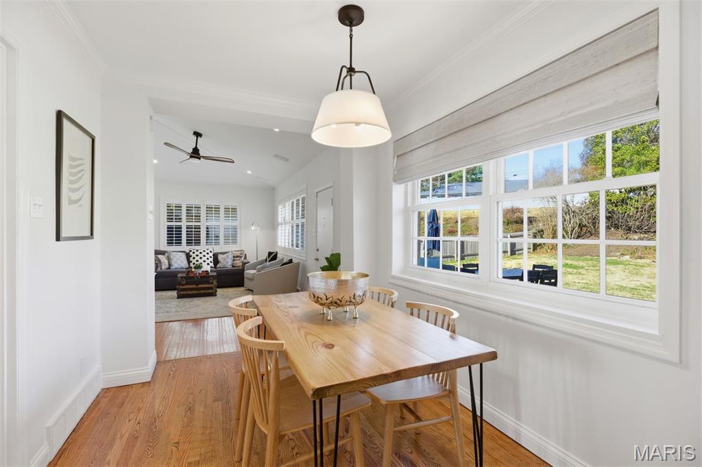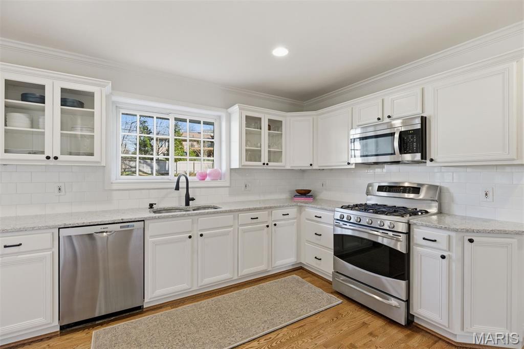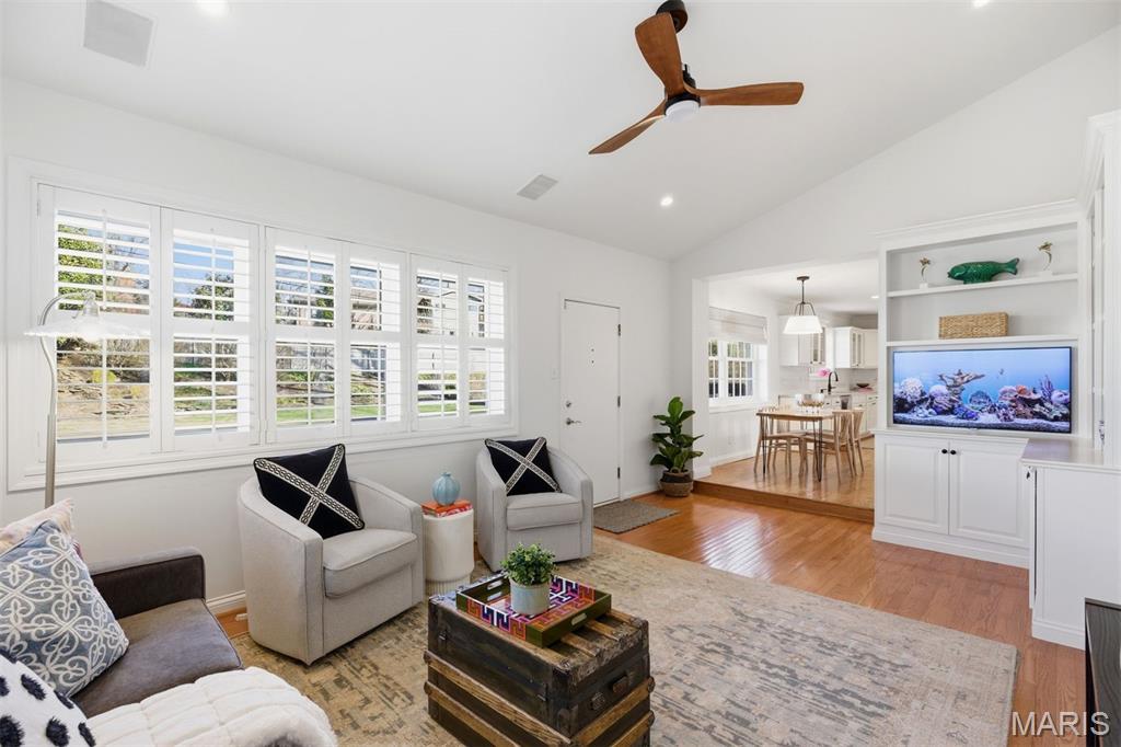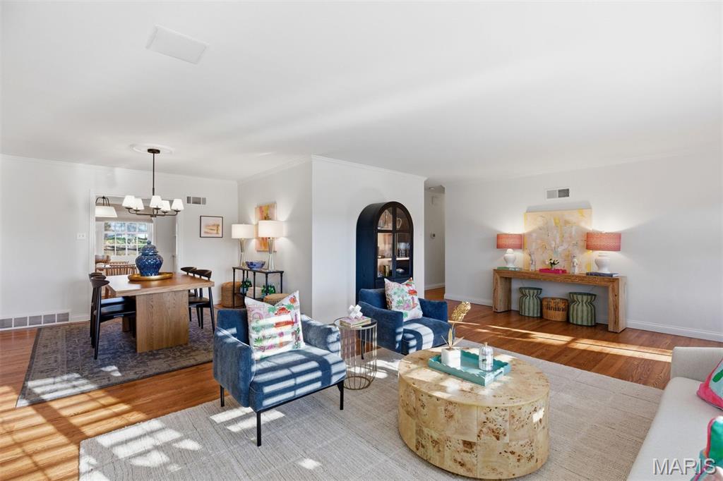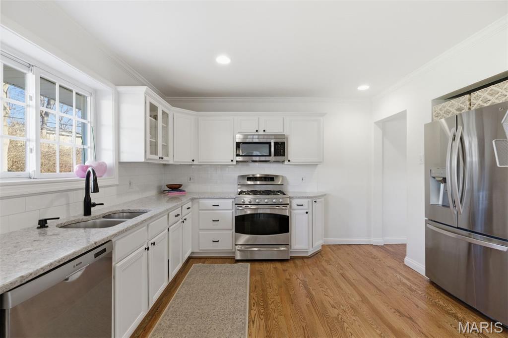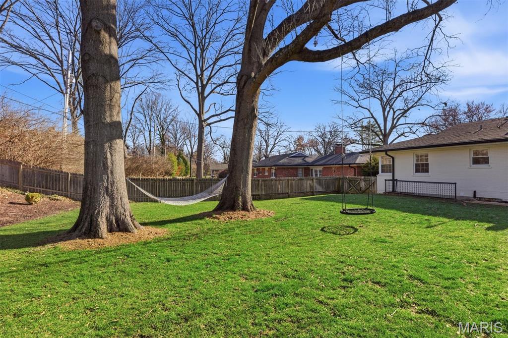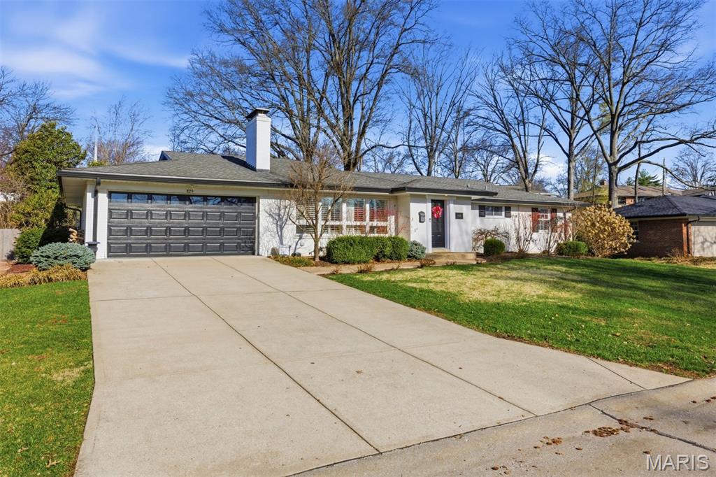 Space, light, and effortless ranch living—set on a rare .4-acre lot in sought-after Warson Woods. This beautifully refreshed 4-bedroom, 3-bath residence offers an exceptional blend of timeless design and modern comfort. Expansive windows and warm hardwood floors create a bright, airy atmosphere throughout the main living spaces, where the gracious living room centers around a classic fireplace framed by custom built-ins, offering both charm and function. The adjoining dining area flows effortlessly for entertaining, while the bright white kitchen features generous cabinetry, stone countertops, stainless appliances, and a sunny breakfast space overlooking the backyard. The primary suite is a peaceful retreat with abundant natural light and generous proportions, while two additional bedrooms and well-appointed baths provide flexible living for guests, family, or work-from-home needs. The finished lower level adds impressive additional living space, offering a large recreation area ideal for movie nights, gatherings, or play, along with a full bath and ample storage. Outdoors, the property truly shines. The expansive .4-acre lot creates a rare sense of privacy and openness, with a spacious patio perfect for dining and entertaining. A tranquil water feature adds a soothing focal point, creating a backyard setting designed for relaxation and connection. With its airy interiors, beautifully scaled living spaces, and coveted Warson Woods location, this home offers an exceptional opportunity.