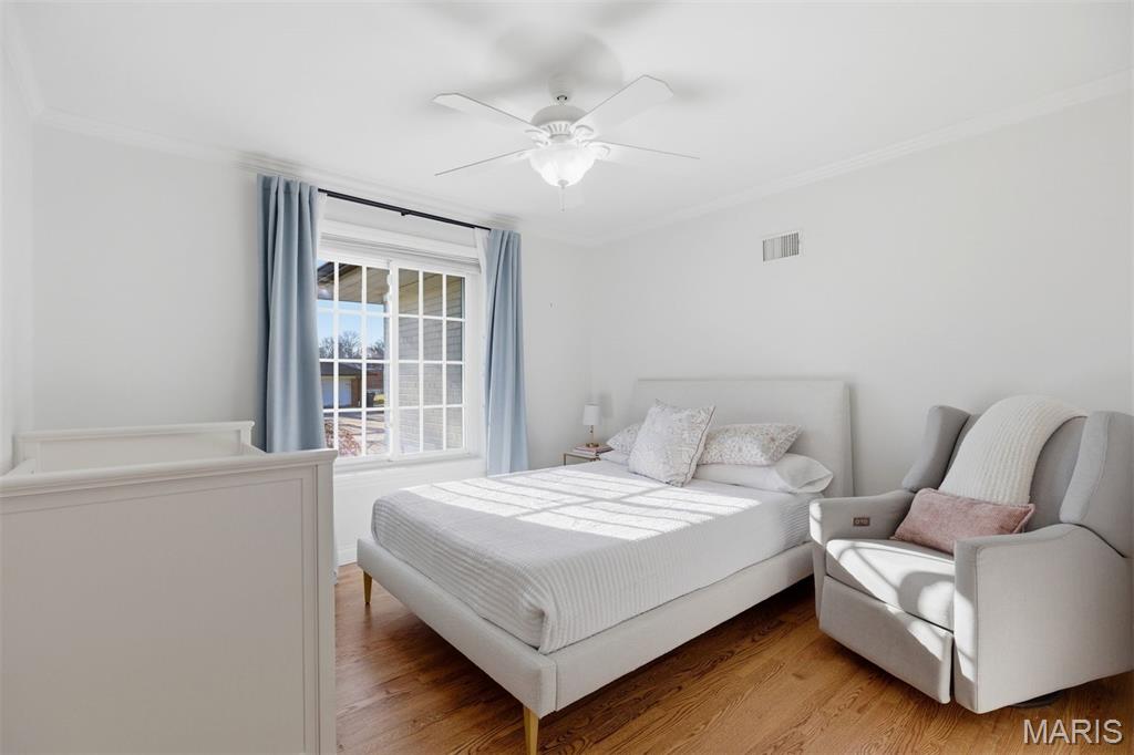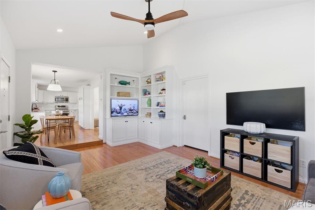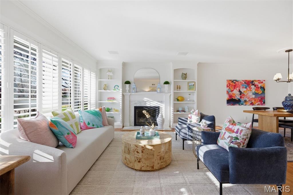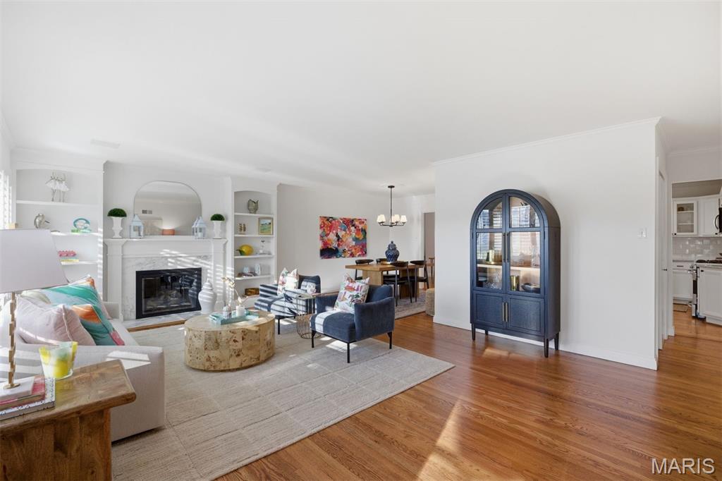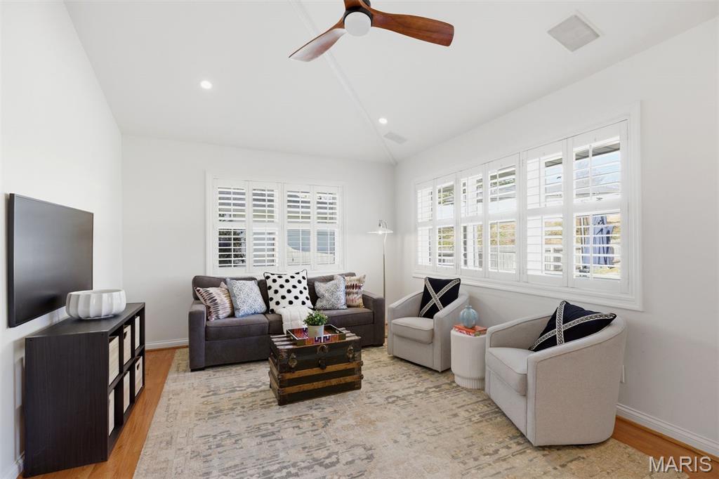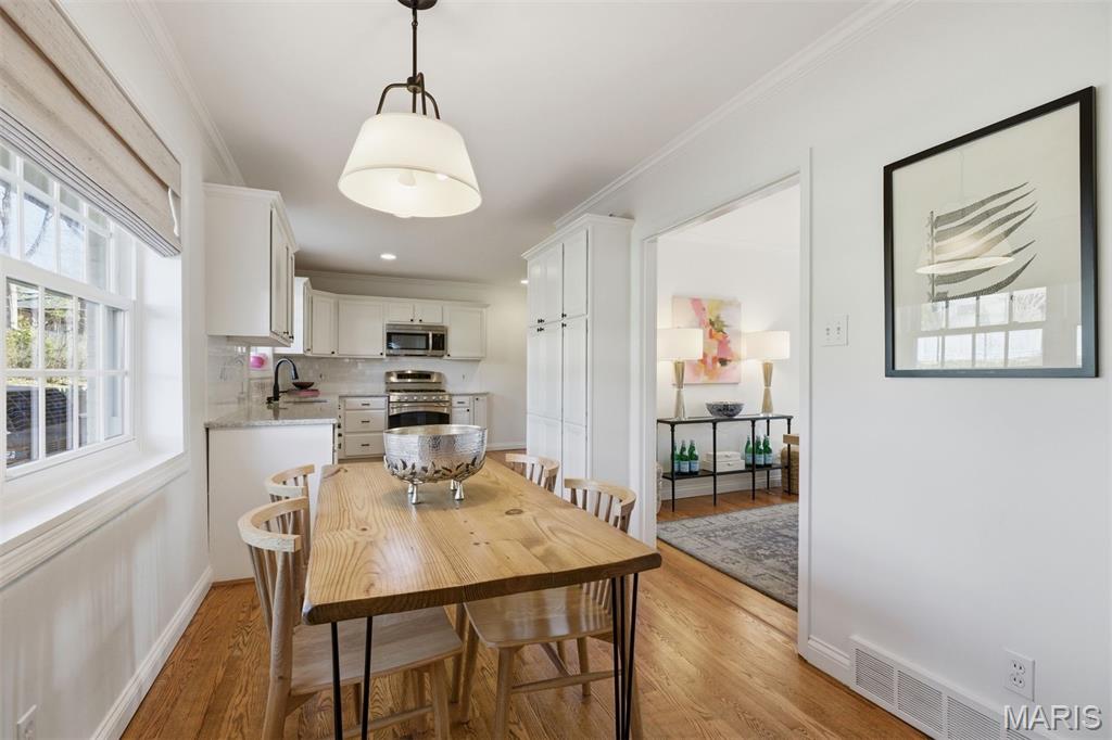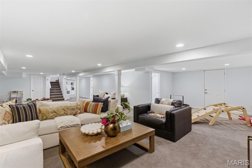 Space, light, and effortless ranch living—set on a rare .4-acre lot in sought-after Warson Woods. This beautifully refreshed 4-bedroom, 3-bath residence offers an exceptional blend of timeless design and modern comfort. Expansive windows and warm hardwood floors create a bright, airy atmosphere throughout the main living spaces, where the gracious living room centers around a classic fireplace framed by custom built-ins, offering both charm and function. The adjoining dining area flows effortlessly for entertaining, while the bright white kitchen features generous cabinetry, stone countertops, stainless appliances, and a sunny breakfast space overlooking the backyard. The primary suite is a peaceful retreat with abundant natural light and generous proportions, while two additional bedrooms and well-appointed baths provide flexible living for guests, family, or work-from-home needs. The finished lower level adds impressive additional living space, offering a large recreation area ideal for movie nights, gatherings, or play, along with a full bath and ample storage. Outdoors, the property truly shines. The expansive .4-acre lot creates a rare sense of privacy and openness, with a spacious patio perfect for dining and entertaining. A tranquil water feature adds a soothing focal point, creating a backyard setting designed for relaxation and connection. With its airy interiors, beautifully scaled living spaces, and coveted Warson Woods location, this home offers an exceptional opportunity.